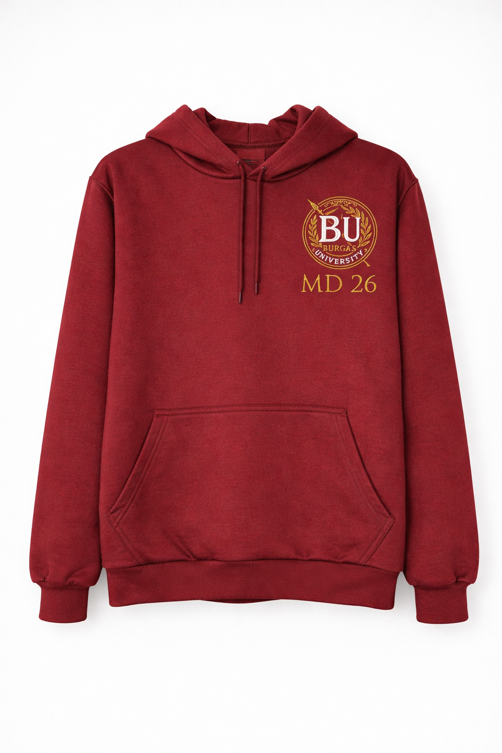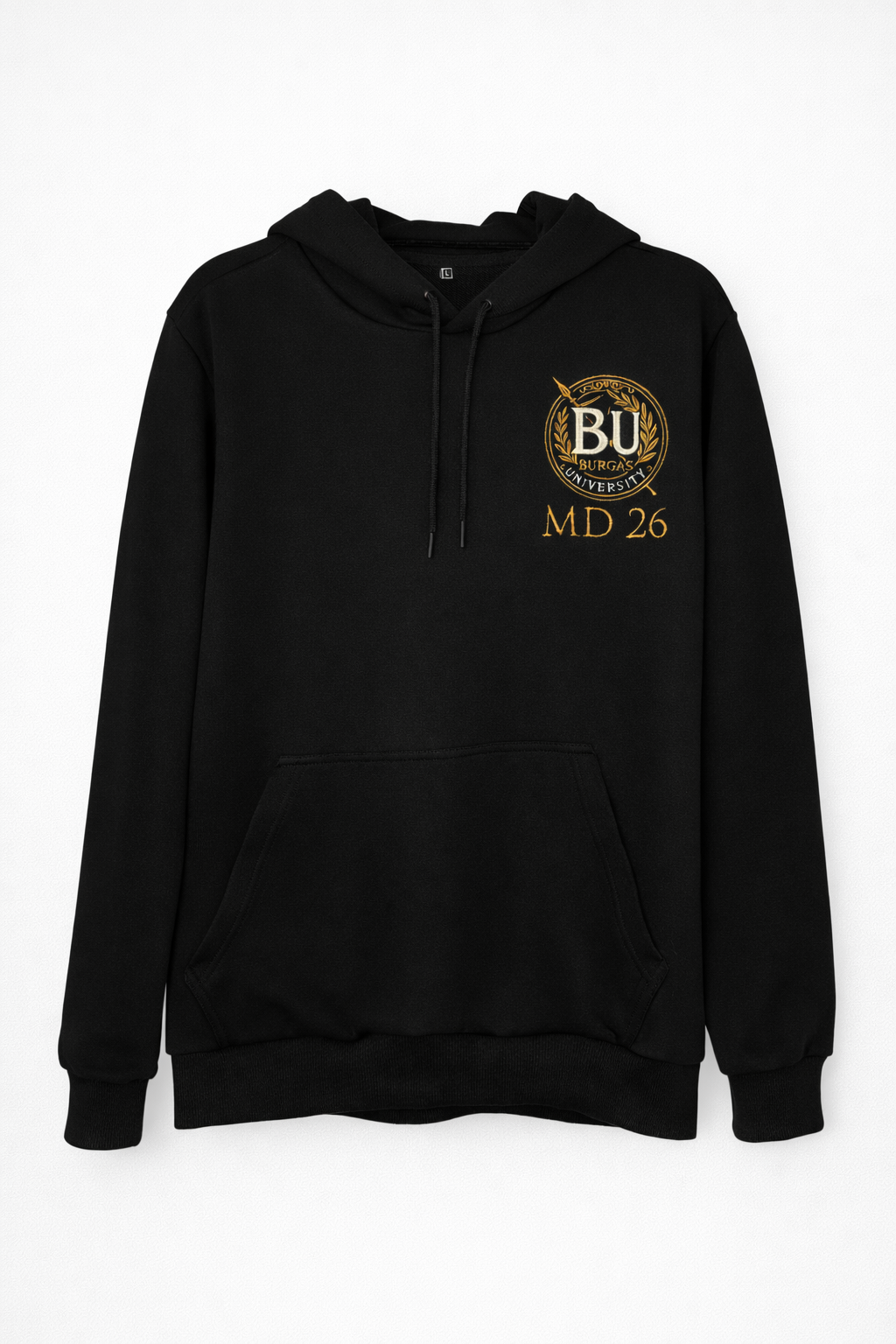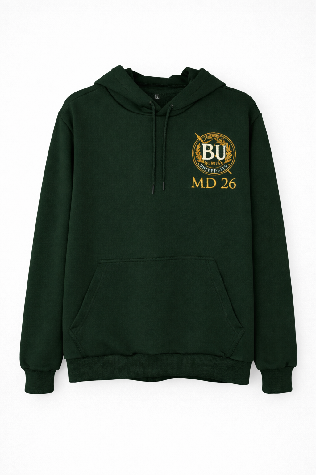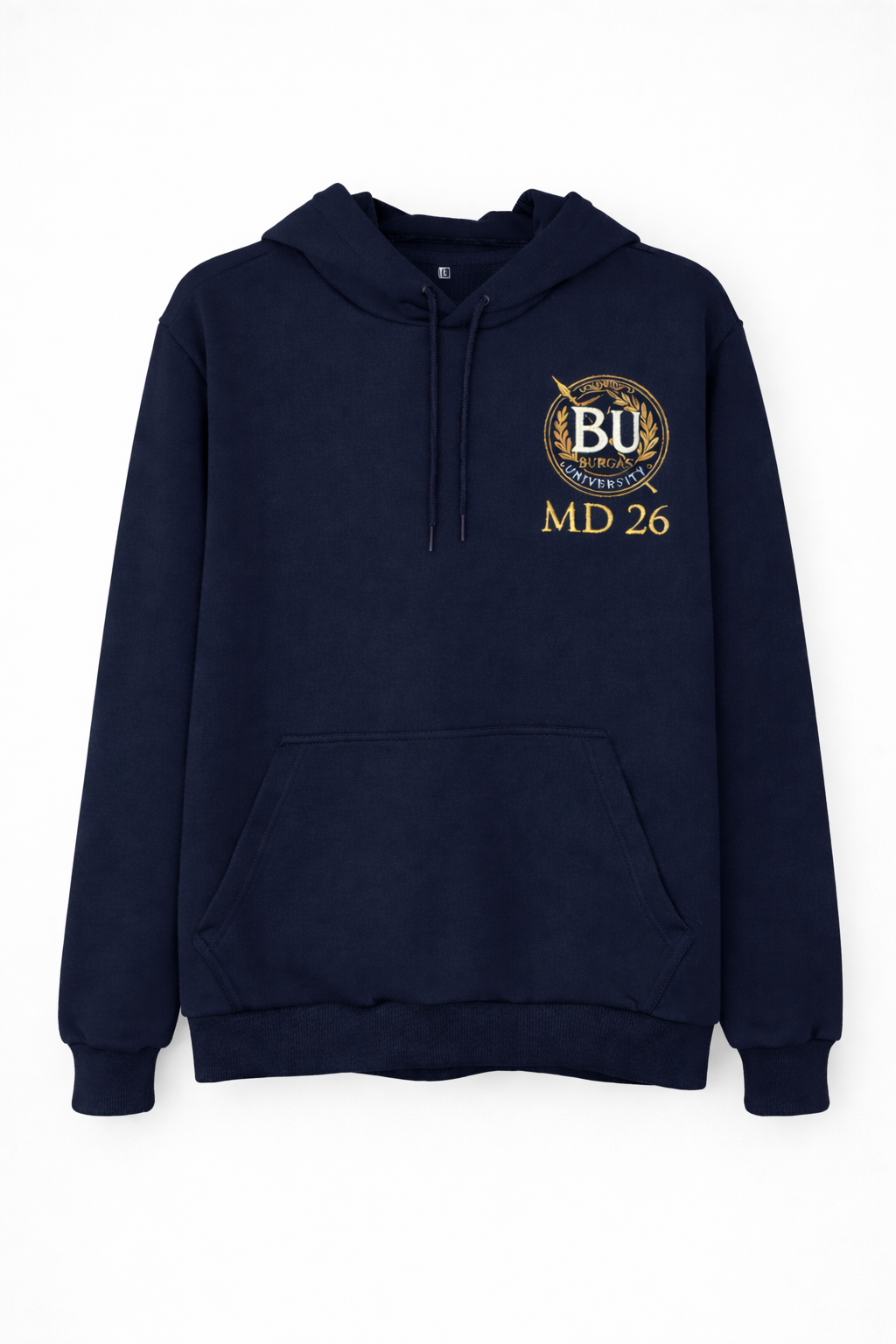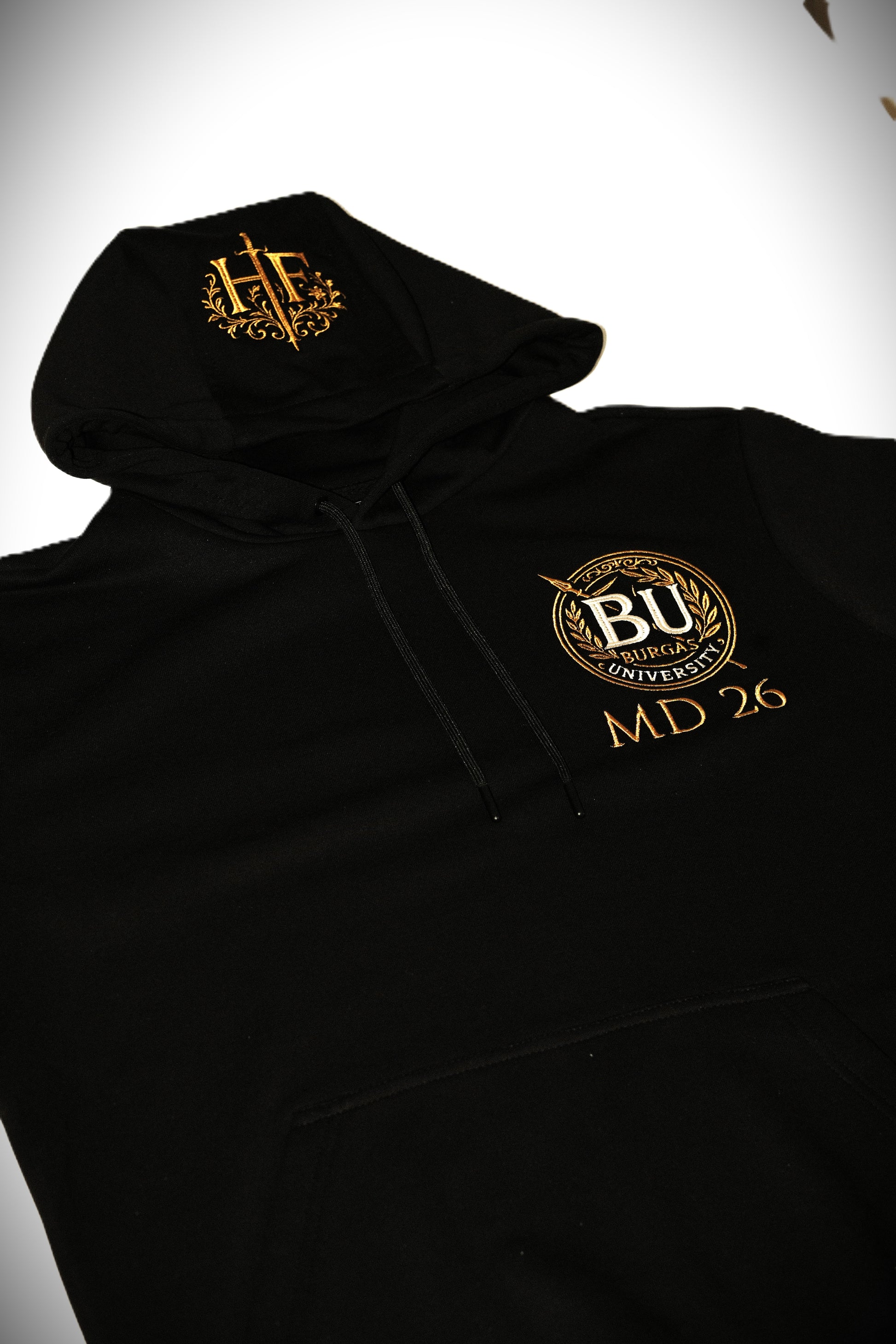 Each hoodie is crafted with the HoodedFaculty logo embroidered on the hood and your chosen university’s crest on the front. Positioned below the crest, the MD or DMD lettering appears beside your graduation year, which is included and fully customizable to your preference (as shown in the image).